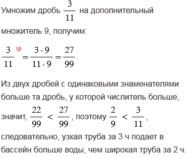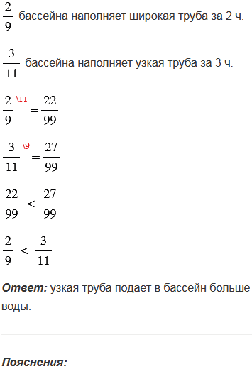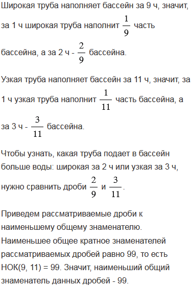 Найдите, какая труба подает в бассейн больше воды: широкая за 2 ч или узкая за 3 ч, если узкая труба наполняет бассейн за 11 ч, а широкая - за 9 ч.