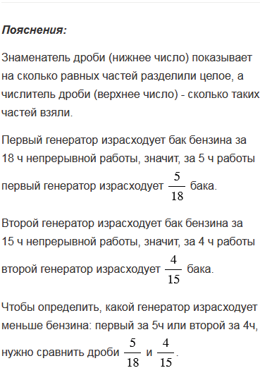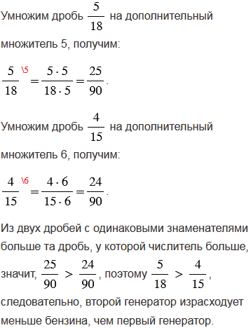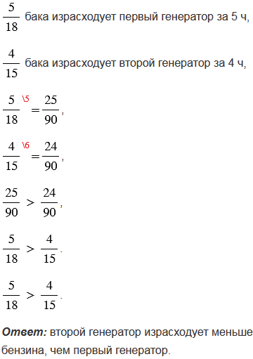Один генератор израсходует бак бензина за 18 ч непрерывной работы, а другой - за 15 ч. Какой генератор израсходует меньше бензина: первый за 5 ч или второй за 4 ч?