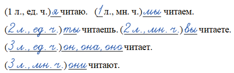 (1 л., ед. ч.) __ читаю.   (_ л., мн. ч.) __ читаем.