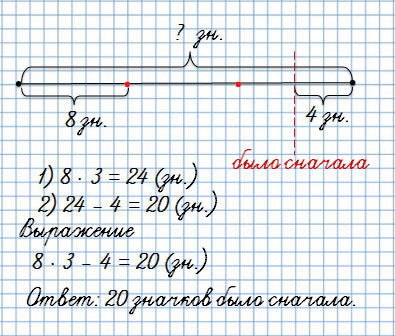 31. У Саши было несколько значков. Друг подарил ему ещё 4 значка. После этого все значки Саша прикрепил к трём флажкам, по 8 значков к каждому. Сколько значков было у Саши сначала?