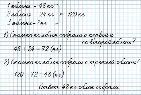 52. С трёх яблонь собрали 120 кг яблок. С первой яблони собрали 48 кг, а со второй - 24 кг. Сколько килограммов яблок собрали с третьей яблони?
