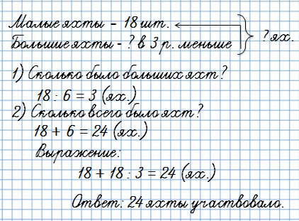 2. В соревнованиях приняли участие 18 малых яхт, а больших в 3 раза меньше. Сколько всего яхт участвовало в этих соревнованиях?