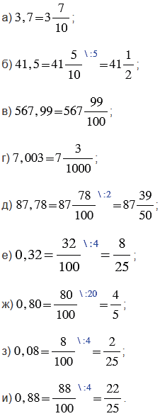 При переводе десятичной дроби в обыкновенную, число, которое идет до запятой, будет целой частью смешанного числа, если целая часть десятичной дроби равна нулю, то получим обыкновенную дробь; в числителе обыкновенной дроби пишем числа стоящие после запятой, если сразу после запятой идет ноль или несколько нулей, их в числитель не пишем; в знаменателе обыкновенной дроби пишем столько нулей, сколько цифр стоит после запятой в соответствующей десятичной дроби.