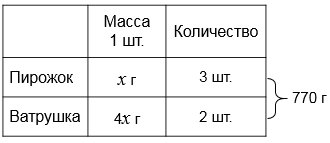1) Пусть масса одного пирожка г, тогда масса одной ватрушки - 4 г. Масса трех пирожков - 3 г, а масса двух ватрушек 2 • 4 = 8 г. Известно, что масса трех пирожков с капустой и двух ватрушек с творогом равна 770 г.