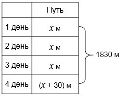 4) Альпинисты поднялись на высоту 1 км 830 м за четыре дня. Первые три дня они поднимались на одинаковую высоту, а в четвертый день - на 30 м больше. Найдите высоту подъема альпинистов в третий день.