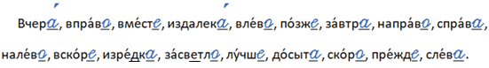 Вчер_, вправ_, вмест_, издалек_, влев_, позж_, завтр_, направ_, справ_, налев_, вскор_, изредк_, засветл_, лучш_, досыт_, скор_, прежд_, слев_.