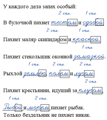 Прочитайте отрывок из стихотворения Дж. Родари «Чем пахнут ремёсла». Впишите в предложения пропущенные имена существительные в форме творительного падежа.