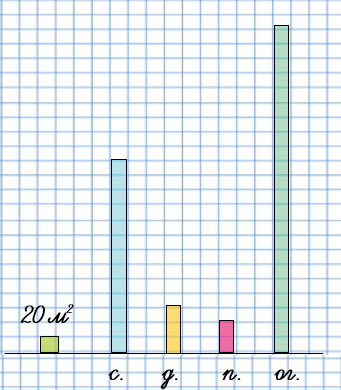 2) На листе клетчатой бумаги построй диаграмму, которая покажет, сколько квадратных метров занимает отдельно сад, дом, огород, парник. Изобрази одной клеткой 20 м2.