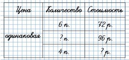 116. Шесть одинаковых пачек печенья стоят 72 р. Сколько таких пачек печенья можно купить на 96 р.?