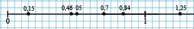 На координатной прямой, единичный отрезок которой равен 10 см, отметьте числа 0,15; 0,5; 0,7; 0,46; 0,84; 1,25.