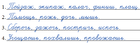 Пейза[ш], помо[щ'], сбере[ч'], угощае[ш], ро[ж], похвали[ш], экипа[ж], кала[ч'], заже[ч'], провожае[ш], фини[ш], до[ч'], постри[ч'], мы[ш], испе[ч'], лечи[ш].
