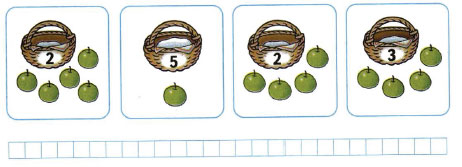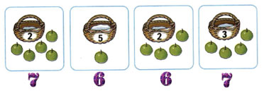 На каждой корзине записано, сколько в ней яблок. Соедини линией рисунки, на которых общее количество яблок одинаковое.