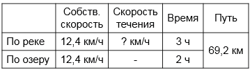 Моторная лодка шла вниз по реке 3 ч, а затем по озеру 2 ч, преодолев за все время 69,2 км. Чему равна скорость течения реки, если собственная скорость лодки 12,4 км/ч?