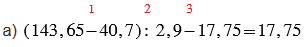 а) (143,65 - 40,7) : 2,9 - 17,75;
