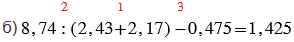 б) 8,74 : (2,43 + 2,17) - 0,475;