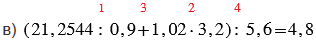 в) (21,2544 : 0,9 + 1,02 • 3,2) : 5,6;