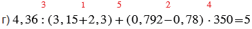 г) 4,36 : (3,15 + 2,3) + (0,792 - 0,78)•350;