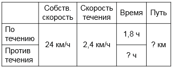 3) 24 - 2,4 = 21,6 (км/ч) - скорость против течения.