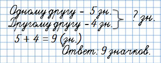Петя подарил одному другу 5 значков, а другому — 4. Сколько всего значков Петя подарил этим друзьям?