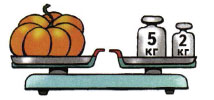 Чаши весов уравновешены. Значит, чтобы узнать, сколько весит тыква, нужно сложить вес двух гирь: 5 кг и 2 кг.
