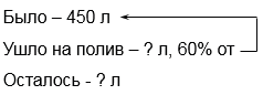 В бочке было 450 л воды. На полив огорода ушло 60% всей воды. Сколько литров воды осталось в бочке?