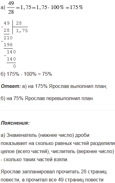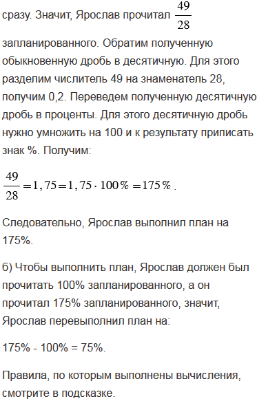 Ярослав запланировал прочитать 28 страниц повести, но она так понравилась мальчику, что он прочитал все 49 страниц повести сразу. Найдите, на сколько процентов он:
