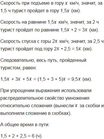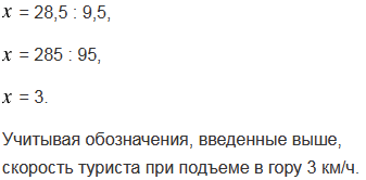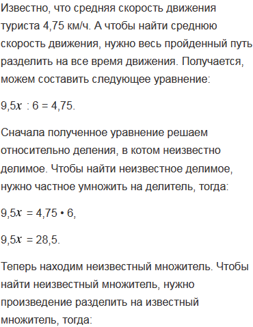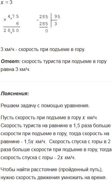 Турист шел 2 ч по равнине, 1,5 ч поднимался в гору и 2,5 ч спускался с горы. Скорость туриста на равнине в 1,5 раза больше скорости при подъеме в гору, а скорость спуска с горы в 2 раза больше скорости при подъеме в гору. Найдите скорость туриста при подъеме в гору, если его средняя скорость на всем пути 4,75 км/ч.