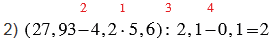 2) (27,93 - 4,2 • 5,6) : 2,1 - 0,1.