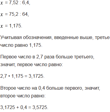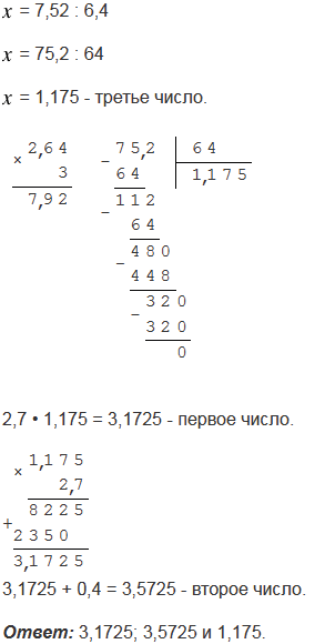 2) Среднее арифметическое трех чисел равно 2,64. Найдите эти числа, если первое число в 2,7 раза больше третьего, а второе на 0,4 больше первого.