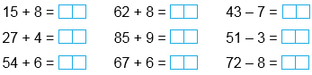 | 15 + 8 = 23 | 62 + 8 = 70 | 43 - 7 = 36 |