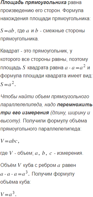 Как найти площадь прямоугольника и квадрата; объем прямоугольного параллелепипеда и куба?