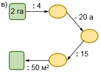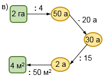 в) 1) 2 га : 4 = 200 а : 4 = 50 а;