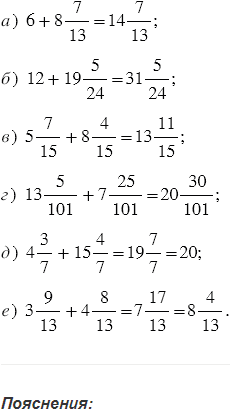 При сложении (вычитании) смешанных чисел нужно целые части сложить (вычесть) отдельно и дробные части тоже отдельно.