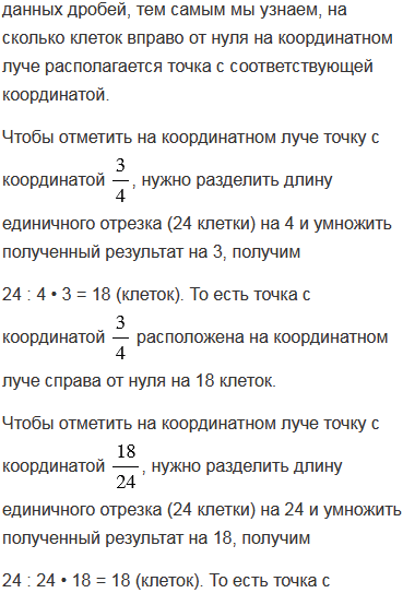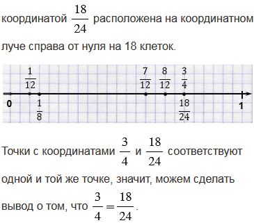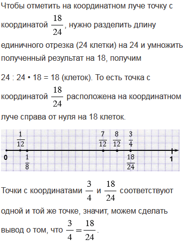 Приняв за единичный отрезок 24 клетки тетради, начертите координатный луч. Отметьте на этом луче точки с координатами . Какие из координат соответствуют одной и той же точке? Запишите равенства.