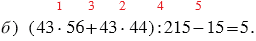 б) (43 • 56 + 43 • 44) : 215 - 15.
