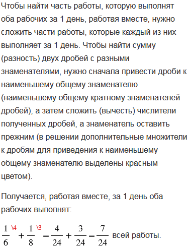 Один рабочий может выполнить всю работу за 6 дней, а другой - за 8 дней. Какую часть работы выполнят оба рабочих за 1 день, работая вместе?