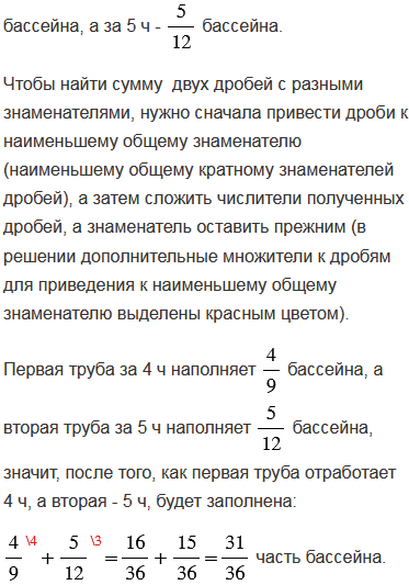 Одна труба может наполнить бассейн за 9 ч, а другая - за 12 ч. Какая часть бассейна будет заполнена после того, как первая труба отработает 4 ч, а вторая - 5 ч?