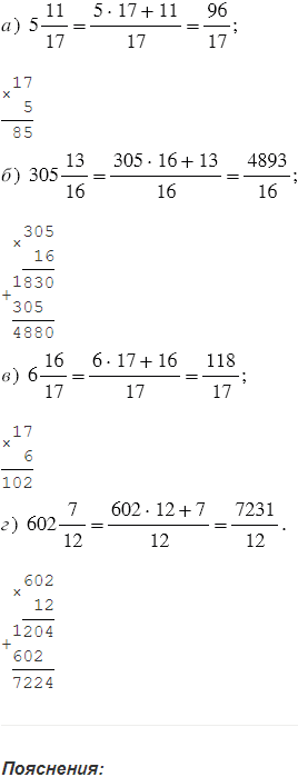 Чтобы преобразовать смешанное число в неправильную дробь, надо целую часть числа умножить на знаменатель дробной части и к полученному произведению прибавить числитель дробной части; эту сумму записать как числитель неправильной дроби, а в ее знаменатель записать знаменатель дробной части смешанного числа.