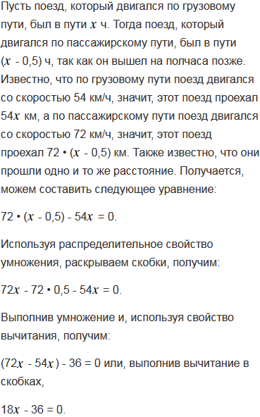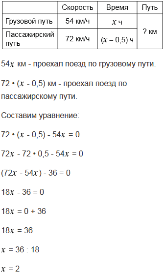От станции отошёл поезд, который двигался по грузовому пути со скоростью 54 км/ч. Через полчаса вслед за ним по пассажирскому пути со скоростью 72 км/ч вышел второй поезд. Сколько времени каждый поезд был в пути, если известно, что на следующую станцию они прибыли одновременно?