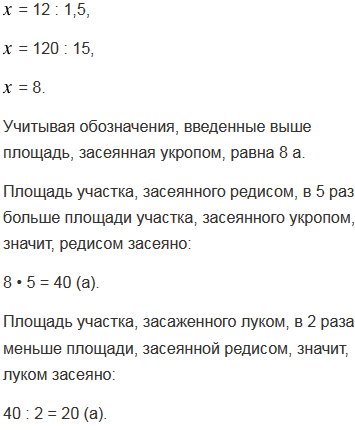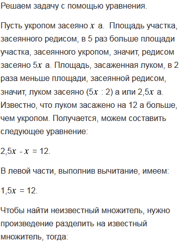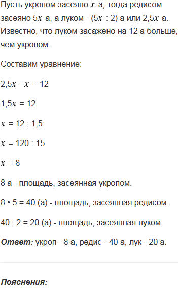 Площадь участка, засеянного редисом, в 5 раз больше площади участка, засеянного укропом, а площадь, засаженная луком, в 2 раза меньше площади, засеянной редисом. Сколько гектаров земли засеяно каждой культурой, если луком засажено на 12 а больше, чем укропом?