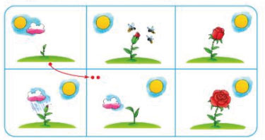 Сначала росток маленький. Потом росток подрос. Затем бутон только появляется. Потом цветок не распустился. Затем цветок распустился, но не большой. Потом роза полностью распустилась.