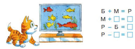 4. Рассмотри рисунок. Разбей группу рыбок (Р) на части по размеру. Что обозначают буквы Б и М? Запиши равенства, заполнив пропуски: