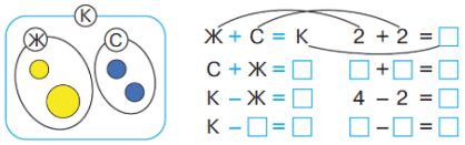 Повторяется запись 2 + 2 = 4. При перестановке слагаемых сумма не изменяется. А также 4 - 2 = 2. Если из целого вычли одну из одинаковых частей, то осталась другая такая же часть.