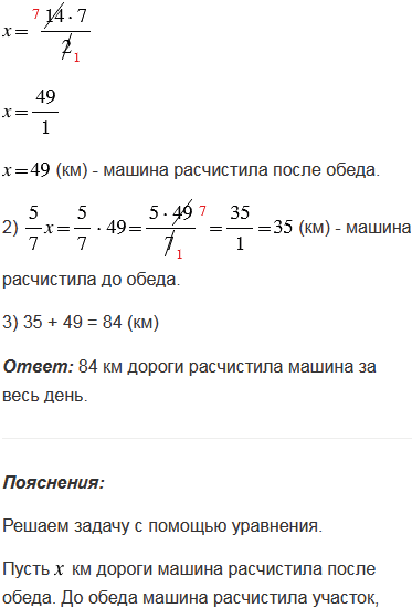 от длины участка, расчищенного ею после обеда. Сколько километров дороги она расчистила за весь день, если участок, расчищенный после обеда, оказался на 14 км больше участка, расчищенного до обеда?