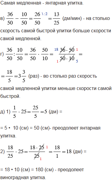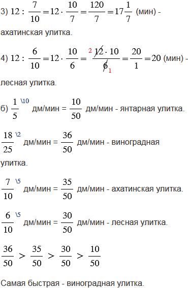 б) Чтобы узнать какая из улиток самая быстрая; самая медленная, нужно скорости улиток привести к общему знаменателю и сравнить полученные дроби.