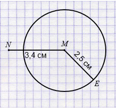 Проведите отрезок NM = 3,4 см и окружность с центром М и радиусом, равным 2,5 см.