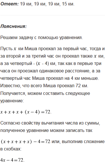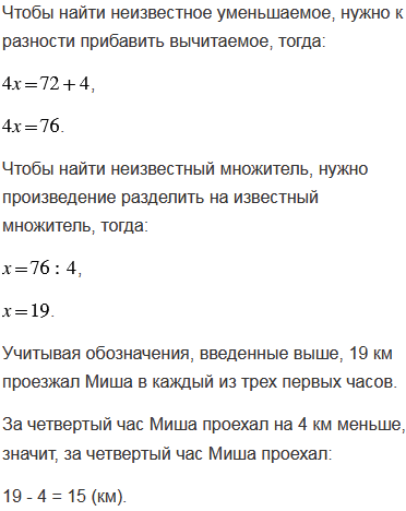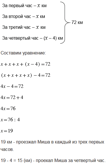 Велосипедист Миша отправился в соседний город, расстояние до которого 72 км. Сколько километров проезжал Миша в час, если в первые три часа он проезжал одинаковое расстояние, а за четвертый час проехал на 4 км меньше?