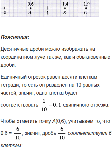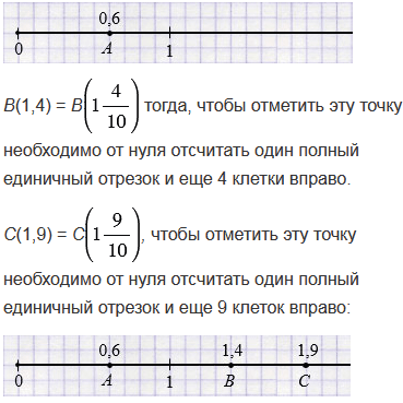 Отметьте на координатном луче точки А(0,6), В(1,4), С(1,9), если единичный отрезок равен десяти клеткам тетради.