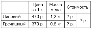 На ярмарке меда 1 кг липового меда стоил 470 р., а 1 кг гречишного - 370 р. Какую сумму надо заплатить за 1,2 кг липового меда и 0,8 кг гречишного вместе?