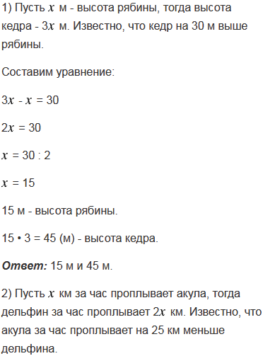 1) Высота рябины в 3 раза меньше высоты кедра. Кедр на 30 м выше рябины. Найдите высоту деревьев